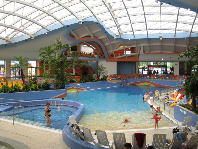 zwei Bohrungen und speisen damit sieben Thermalbade- und Schwimmbecken.